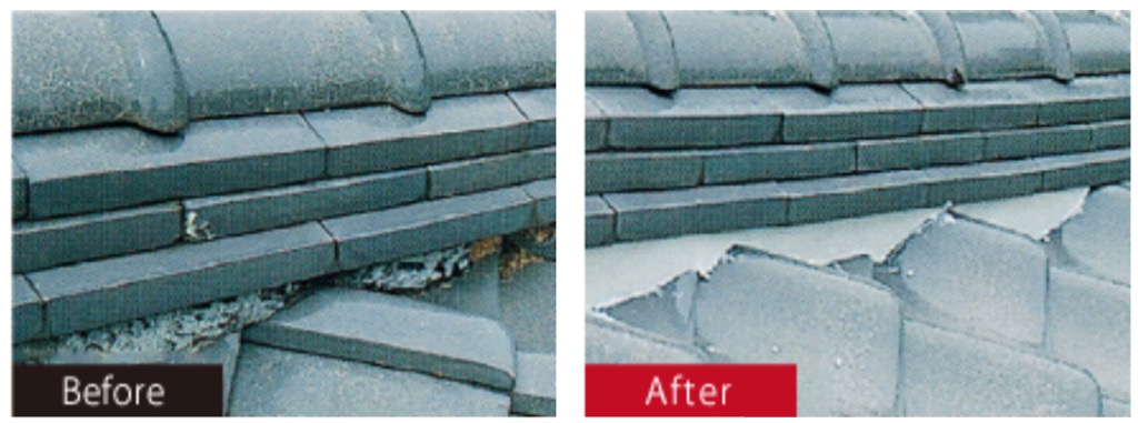 漆喰工事とは、瓦と瓦の接着剤である漆喰を補修する工事です。漆喰が傷んでしまうと接着剤としての機能を果たさなくなり瓦にズレが生じてしまい、破損や落下の原因につながります。